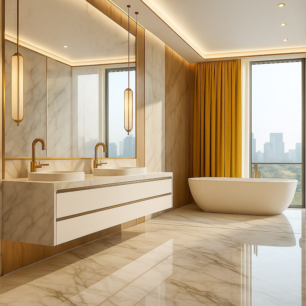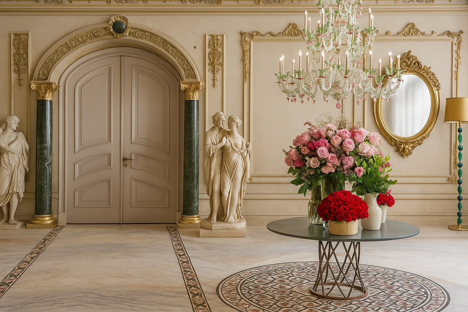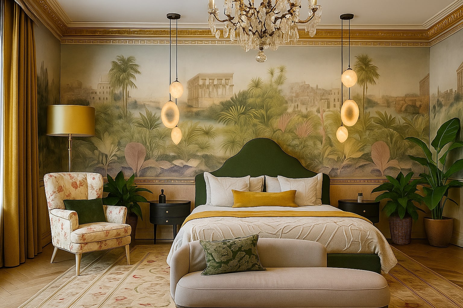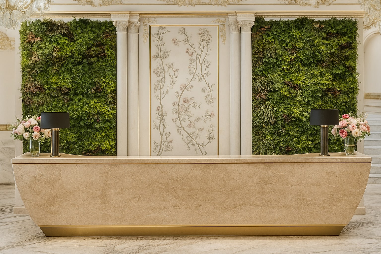 The design features open, flowing spaces enhanced by arches, travertine cladding, and natural stone flooring. The lobby celebrates grandeur with marble reception desks, custom chandeliers, and a central water fountain reminiscent of Kensington Palace. Each Executive Suite offers a serene escape — oak wood flooring, traditional paneling, embroidered fabrics, and organic forms create a calming ambiance infused with natural light and warmth.