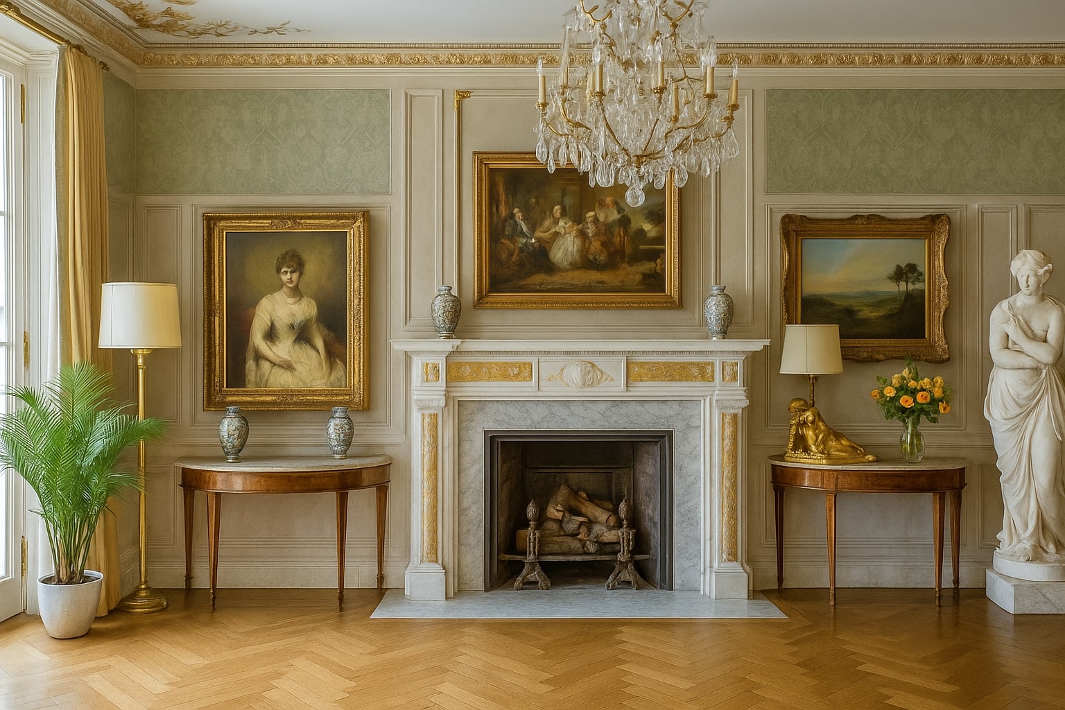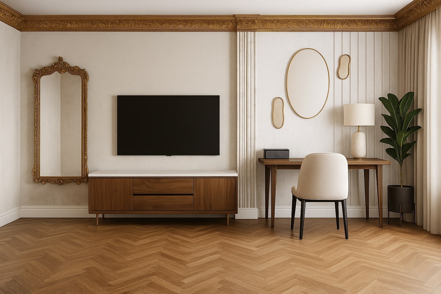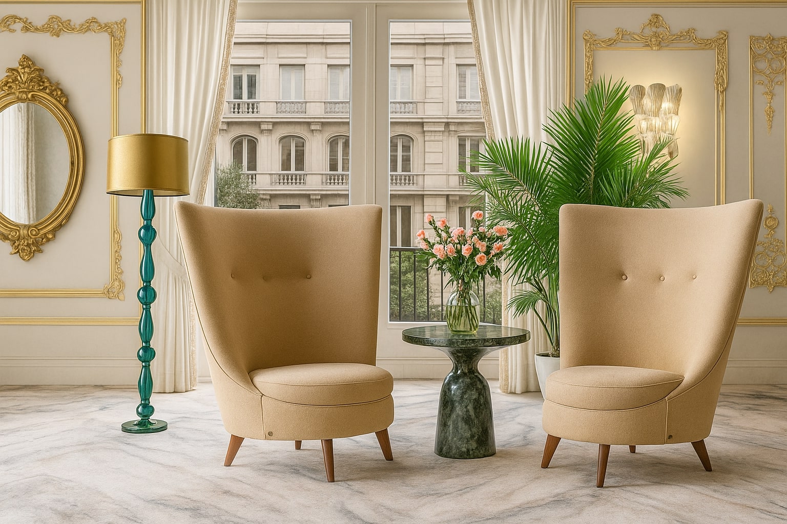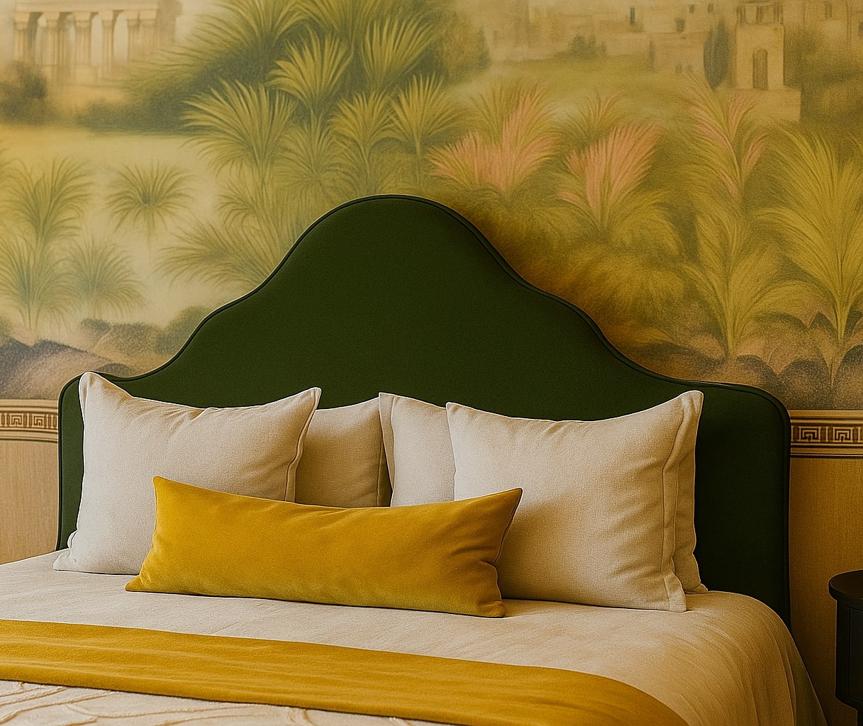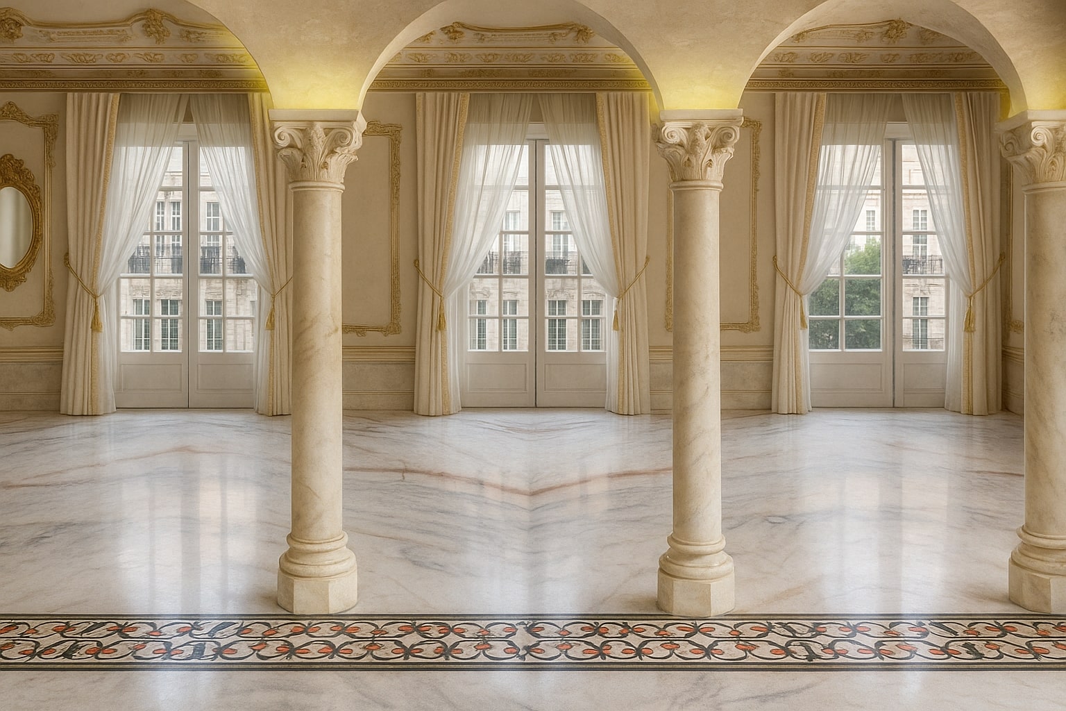 The design features open, flowing spaces enhanced by arches, travertine cladding, and natural stone flooring. The lobby celebrates grandeur with marble reception desks, custom chandeliers, and a central water fountain reminiscent of Kensington Palace. Each Executive Suite offers a serene escape — oak wood flooring, traditional paneling, embroidered fabrics, and organic forms create a calming ambiance infused with natural light and warmth.