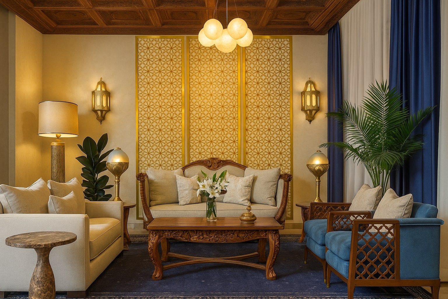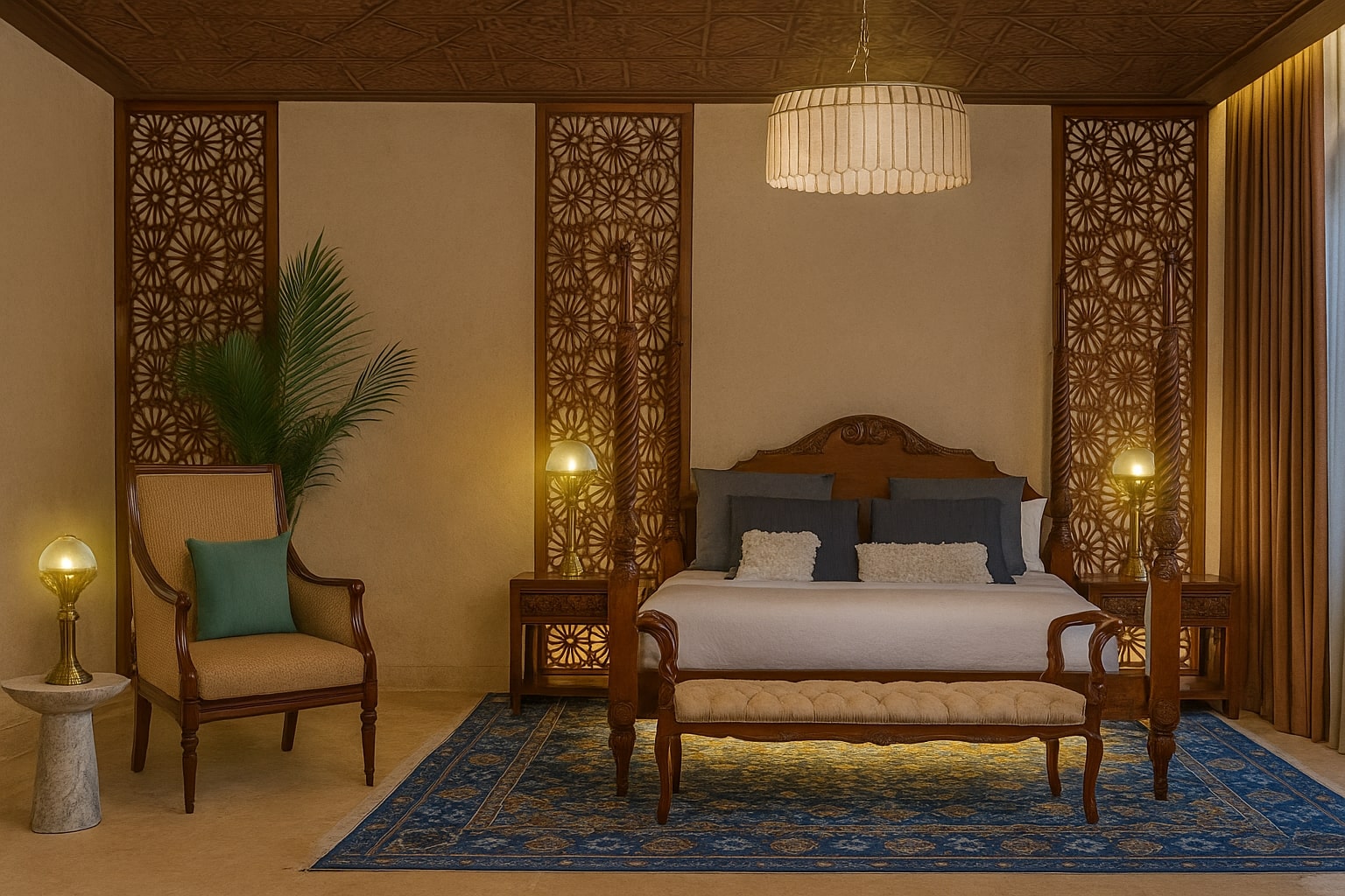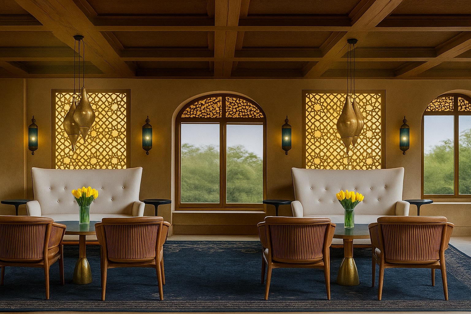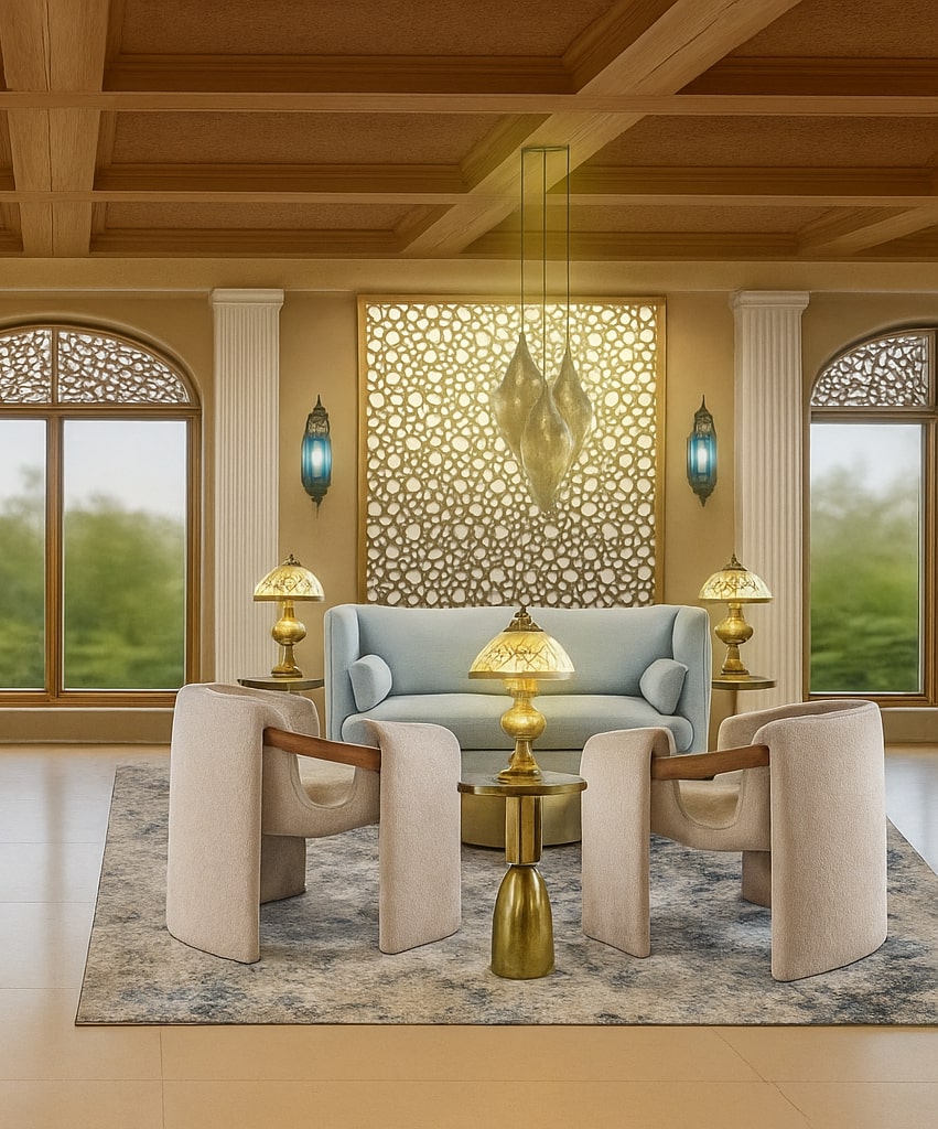 - Traditional arches, mashrabiya screens, carved plaster walls