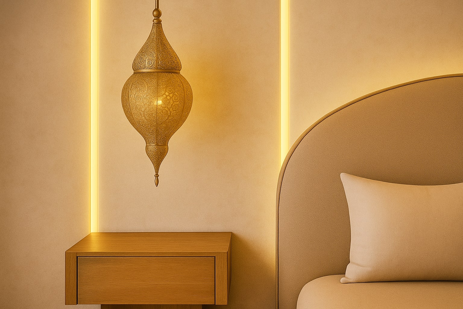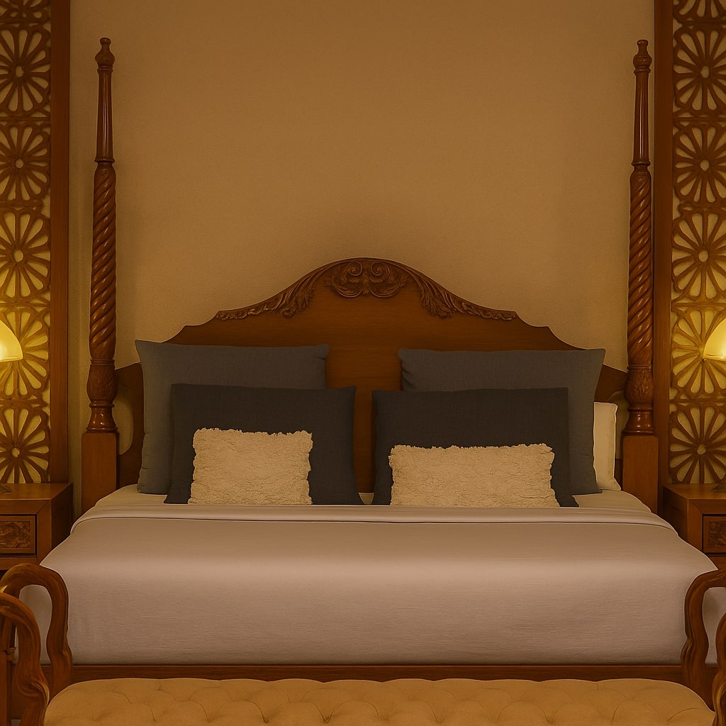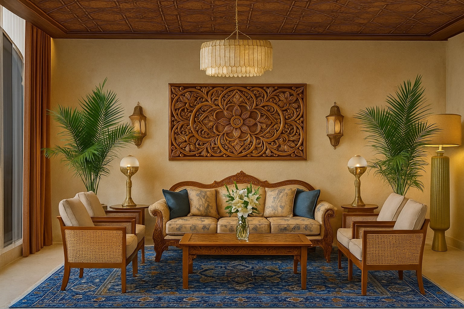 - Traditional arches, mashrabiya screens, carved plaster walls