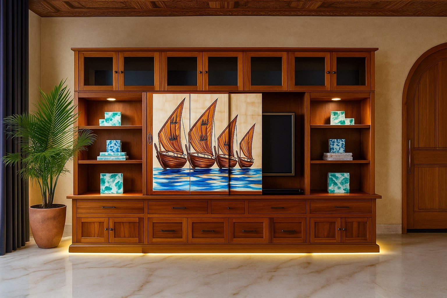 - Luxurious finishes: marble, brass, mother-of-pearl inlays