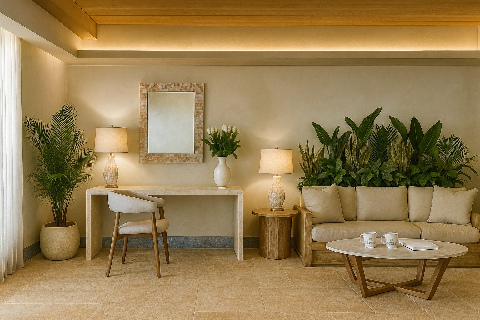 - Biophilic integration: natural light, greenery, flowing forms