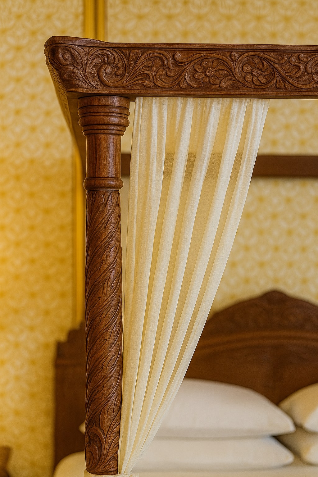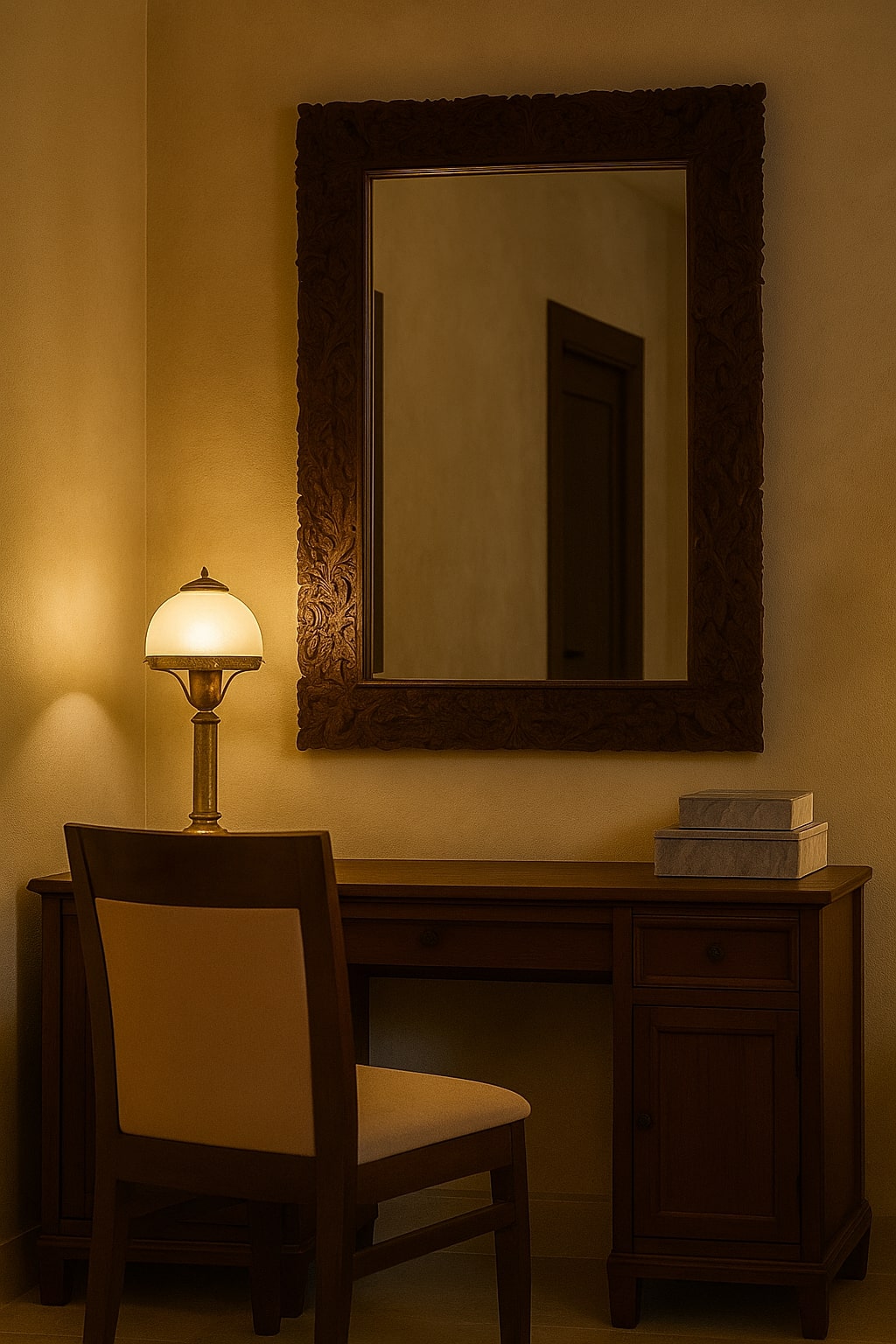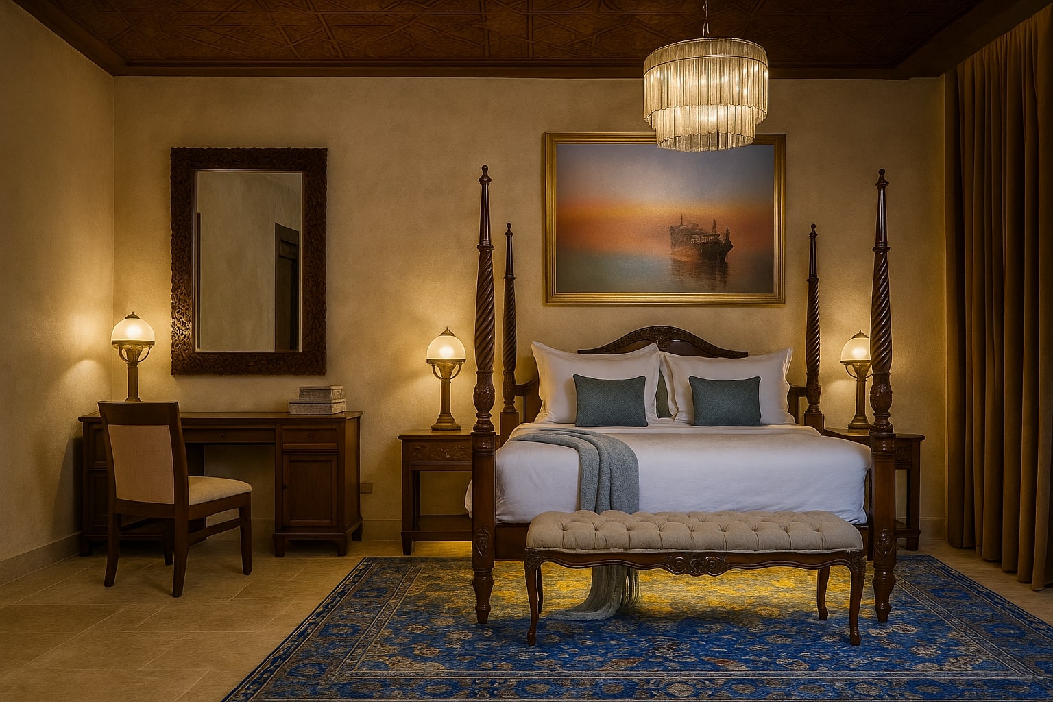 - Craftsmanship: Custom woodwork, carved plaster, calligraphy, and mosaic details