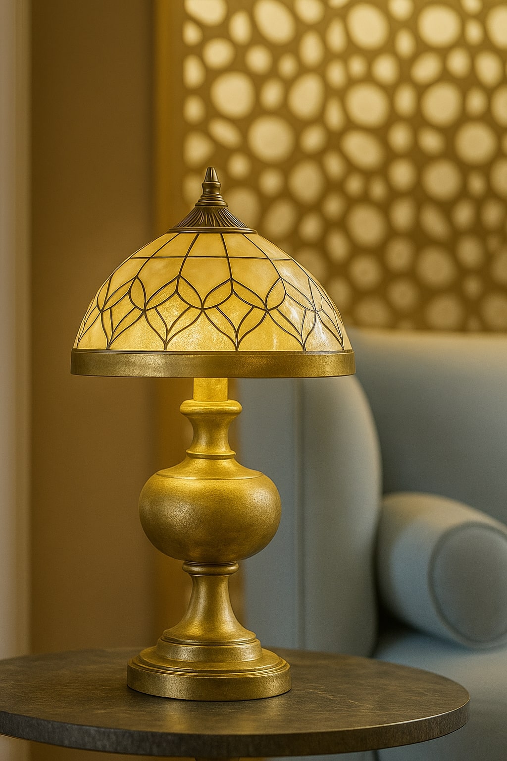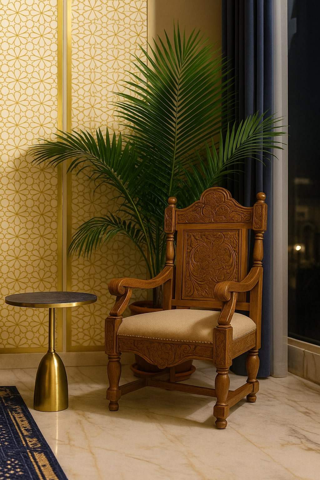 - Mashrabiya paneling and marble flooring
